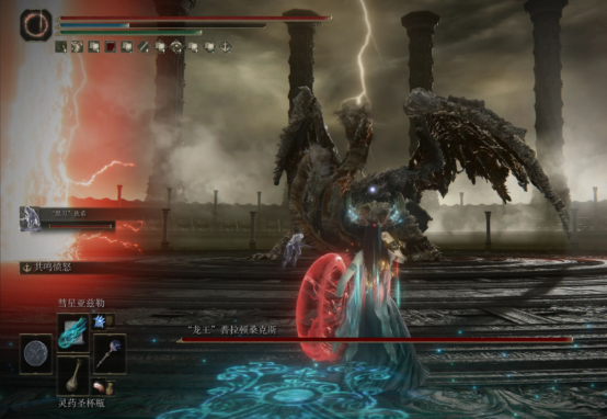 从叙事层面看,龙王普拉顿桑克斯作为古龙族代表,其战斗设计延续了魂系游戏对巨龙类敌人的传统塑造——强调压迫感与招式识别。雷电特效与云层穿梭的机制,既符合神话生物设定,又通过环境互动提升战斗立体感。该战斗本质上考验玩家对BOSS行为模式的记忆与应变能力,而非单纯数值对抗。