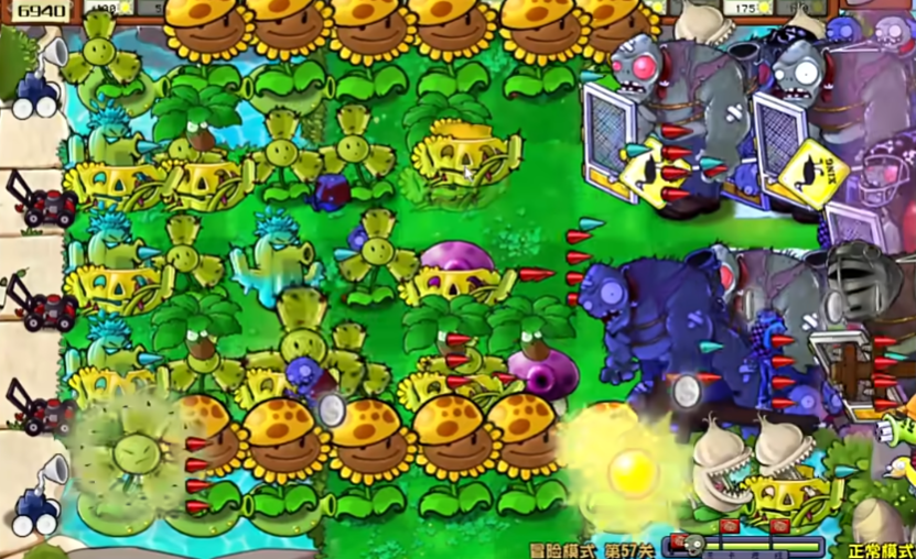 植物大战僵尸杂交版冒险模式第57关的核心挑战在于应对大量巨人僵尸和冰车巨人僵尸的混合进攻。开局需快速建立阳光经济,优先在左侧种植阳光向日葵,确保阳光供应充足。第一列必须放置汉堡射手,用于拦截挖矿僵尸的偷袭。随着阳光积累,逐步在中间草坪补充两列汉堡射手作为主力输出,右侧则用土豆雷和火辣坚果形成临时防线。本关需特别注意冰车巨人的推进速度,建议保留窝瓜和辣椒坚果作为紧急反制手段。