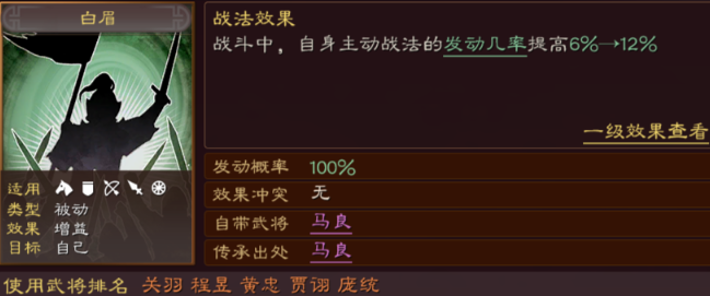 战法搭配方面,曹真优先选择提升主动战法发动率的白眉,该战法能使自身主动战法发动概率提高6%-12%,有效弥补四星武将发动率不足的缺陷。另一推荐战法为偃旗息鼓,准备一回合后可为两名友军提供12.5%-25%谋略伤害加成,并对敌方单体造成105%-210%谋略攻击,这种双修伤害特性完美契合曹真兵刃与谋略混合的输出模式。若追求极致输出,可拆解其传承战法屠几上肉,该战法同时造成118%兵刃与谋略双重伤害,但需注意后期将其转移给更高属性武将使用。