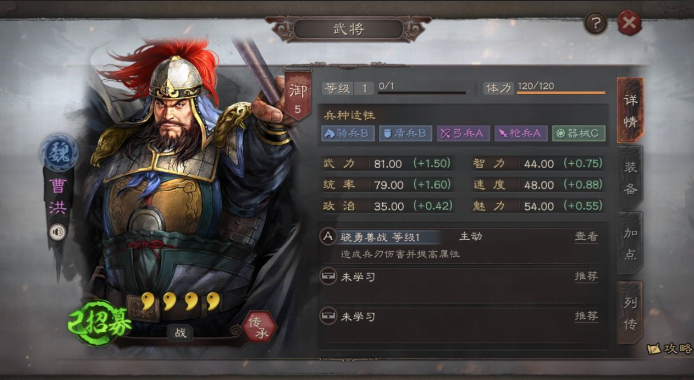 曹真作为三国志战略版中统御值为5的四星武将,其兵种适性以骑兵和盾兵为主(A级),其他兵种表现较弱,因此推荐围绕这两种兵种构建阵容。他的核心定位是前期开荒过渡型武将,具备攻防均衡的特点,自带战法骁勇善战可对敌军单体造成150%-300%兵刃伤害并提升自身20-40点速度,兼具输出与先手优势。在资源有限的新手期,曹真凭借较低统御值和稳定输出成为性价比极高的选择。