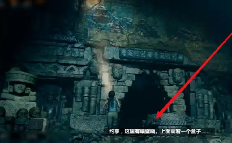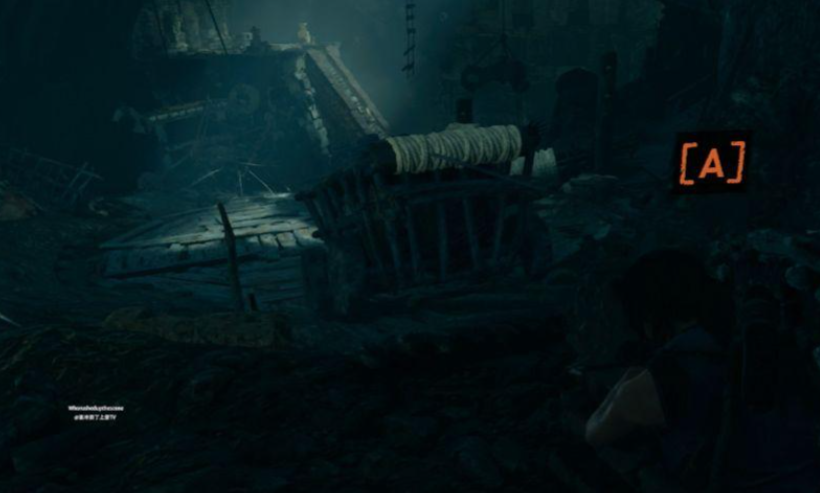 将推车推到转盘附近后,按互动键旋转转盘使推车有绳索的一端朝向劳拉。用绳索箭矢将推车和转盘连接后再次转动转盘,将推车拉上斜坡。走到绳索前按近战攻击键切断绳索,推车会滑下斜坡将卡住的吊钟撞出去。这个机关的原理是利用被推出去的吊钟重量将右侧另一个吊钟抬高,从而创造新的攀爬路径。