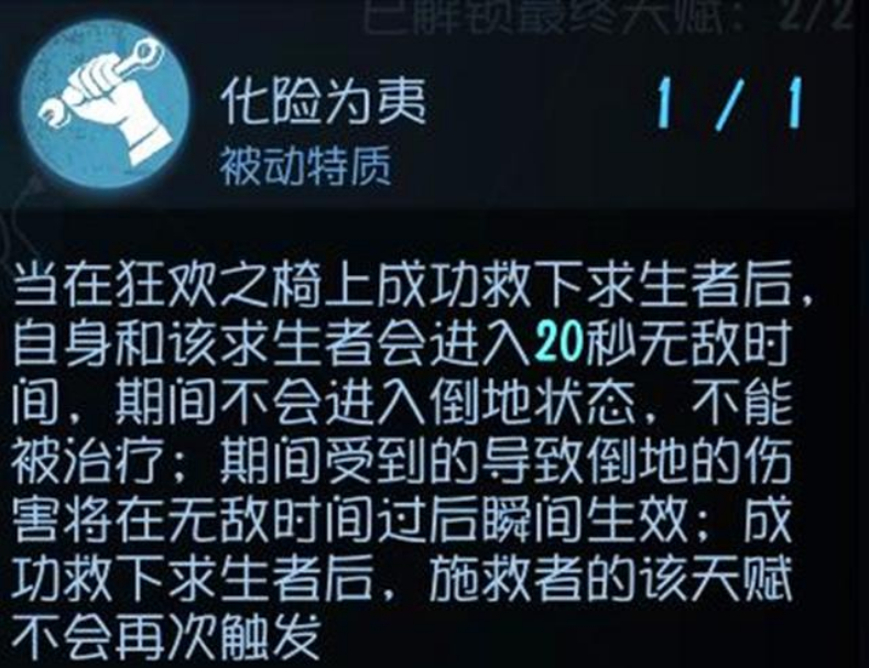 搏命挣扎是求生者天赋化险为夷触发后的效果,属于救人位的核心天赋。该天赋位于天赋页最下方的分支,需消耗一定天赋点解锁。化险为夷的效果是:当携带该天赋的求生者从狂欢之椅上救下队友时,双方会获得20秒的无敌状态,期间无法被击倒,但也无法接受治疗。状态结束后,若期间受到的伤害累计超过倒地阈值,被救者会立即倒地。
