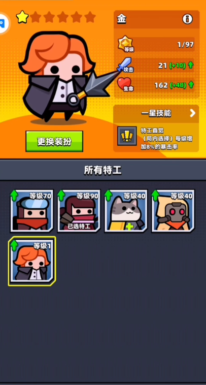 金的技能非常强力,一星技能特工直觉能增加暴击率,三星后进化为致命感应,进一步提升暴击伤害和生命值。六星技能幸运绝杀更是让暴击判定失败时追加一次判定,相当于变相提高输出。这些技能让她在战斗中表现突出,尤其是搭配暴击流装备时,伤害提升非常明显。如果想最大化她的潜力,建议优先培养到三星以上,这样技能效果会更加稳定。