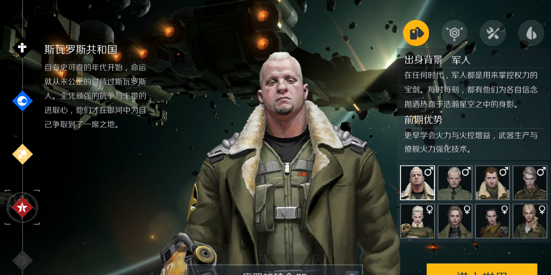 目前游戏提供四种职业:军人、工程师、科学家和探险家。军人擅长武器强化和武器生产类科研,工程师专注于能量强化和装备生产,科学家精于护盾强化和舰船生产,而探险家则偏向推进强化和信号扫描类科研。职业选择不会永久限制发展方向,后期可通过洗点调整,但初期选择仍需谨慎。