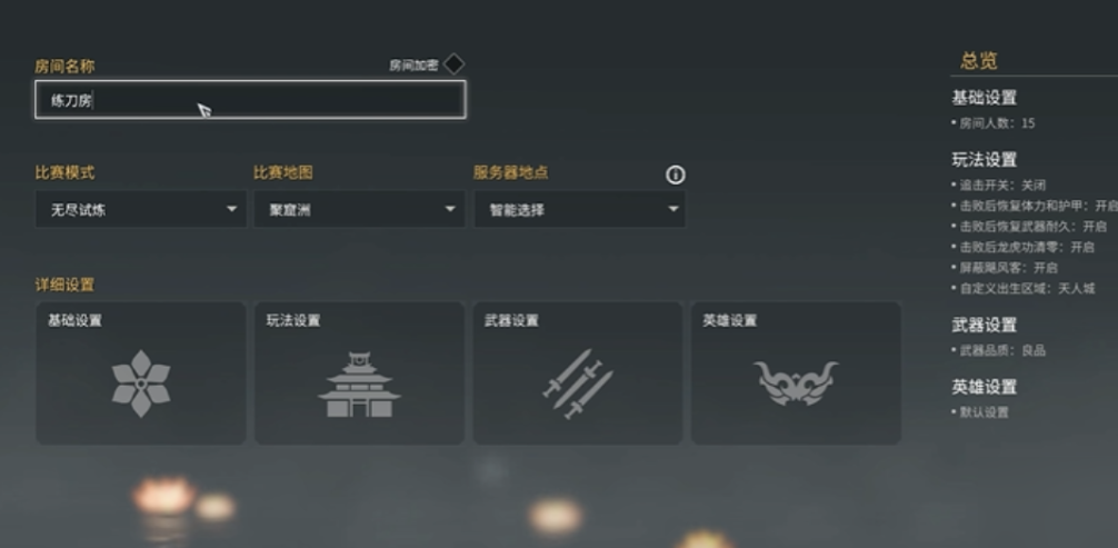 练刀房分为两种主要形式:自定义多人房间与单人训练场。前者通过自定比赛-创建房间实现,需设置房间名称、密码及对战规则,适合与好友针对性练习振刀、连招等技巧;后者为系统预设的自由练习模式,提供无限复活和固定装备,适合基础操作磨合。多人练刀房推荐将护甲设为极品、武器为凡品以延长对抗时间,同时开启击败后自动恢复状态功能减少补给操作。