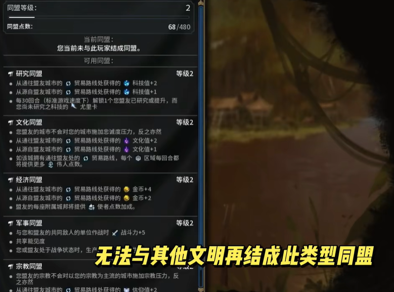 同盟系统被细分为科研、军事、经济等五大类型,每类同盟具备三级成长体系。初级同盟仅提供基础加成,三级同盟则能共享科技研发进度。紧急状况系统取代传统世界议会,当某文明过于强大时,系统会强制触发多文明联合讨伐条约,这种动态制衡机制有效缓解了后期AI强度失衡问题。