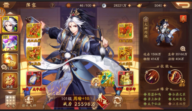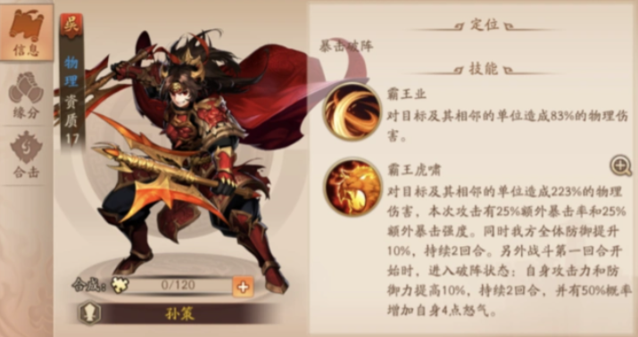 吴国赤金阵容的核心在于利用灼烧效果和持久战能力,通过合理的武将站位与技能联动实现攻防一体。甘宁作为主力坦克应放置在一号位,利用其高闪避和第三回合后的爆发特性为团队争取生存空间。陆逊与周瑜分别占据二号和三号位,前者提供群体攻击增益与灼烧叠加,后者则通过火神状态强化团队坦度与控制能力。小乔作为关键辅助位于四号位,负责群体治疗与怒气恢复,确保队伍续航。孙策和主角分别安排在五号及六号位,前者依靠高爆发补足伤害,后者则根据时装特性灵活调整站位以应对不同战局。