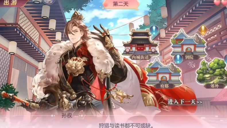 达成孙权出游的完美结局,关键在于选择正确的对话选项和游览路线。首先在任务开始时,一定要选择同意孙权的出游提议,这样才能顺利进入后续场景。第一天的主要选择包括:在府邸同意举办读书会,在别院拿佃猎箭,在内城街道简单打个招呼,最后在雅集社选择先在书院探查一番。这些选项能确保初始好感度稳定提升。