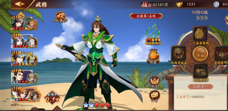 金将作为顶级战力,赵云、关羽、诸葛亮、周瑜和张角组成的阵容表现非常出色。赵云凭借龙胆亮银枪的眩晕效果和勇者之魂的生存加成,能扛能打;关羽的三国第一神刀具备高爆发和斩杀能力,配合万夫莫敌提升全队攻击;诸葛亮则是团队核心,八阵图增强攻防属性,策略之主进一步强化输出节奏;周瑜的赤壁战火附带灼烧效果,东吴之主提升自身攻防;张角的天灾降世提供强力AOE,乱世之源增强团队攻防。这套组合兼顾输出、控制和辅助,适合应对大多数强敌挑战。