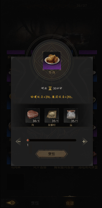 炸鸡是一种紫色品质的食物,能够为玩家提供30分钟内物理攻击和魔法攻击各提升3点的增益效果。制作炸鸡的配方为兽肉+发酵粉+盐,这三种材料均可通过游戏内的怪物掉落或商店购买获得。需炸鸡的制作并不需要鸡肉,因此玩家无需刻意寻找特定名称的肉类素材。