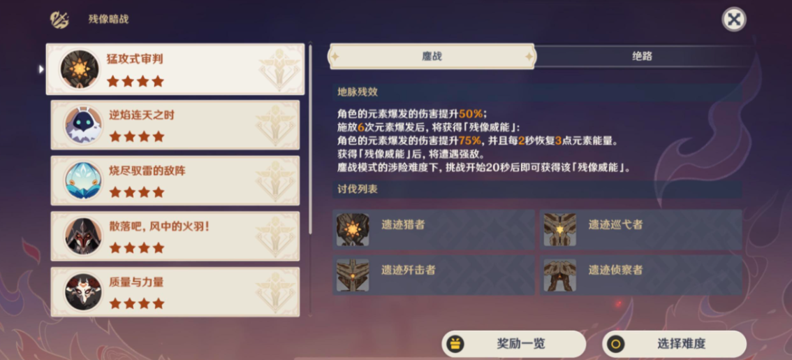 活动中的地脉残效是特殊增益效果,需释放指定次数元素爆发后触发,效果为提升75%元素爆发伤害并每2秒恢复3点元素能量。该机制直接影响战斗节奏与奖励获取速度,建议在挑战前确保队伍角色充能完毕。绝路模式需先完成鏖战模式的死斗难度才可解锁,其奖励主要为精锻用魔矿,但难度较高需谨慎选择。