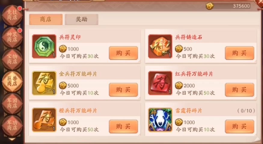 商店系统是资源获取的核心渠道之一,合理规划购买策略能显著提升阵容强度。竞技商店优先兑换本国武将碎片和进阶丹,前者用于核心武将升星,后者是武将突破的关键材料。装备商店建议直接跳过紫色装备,集中资源购买橙色装备过渡,后期转向红色装备。宝物商店需谨慎对待随机宝箱,优先兑换虎符和精炼石,65级后红宝箱必出红色碎片,可提前囤积货币。巨兽商店的兵符碎片和万能碎片性价比最高,中期可快速补齐阵容短板。