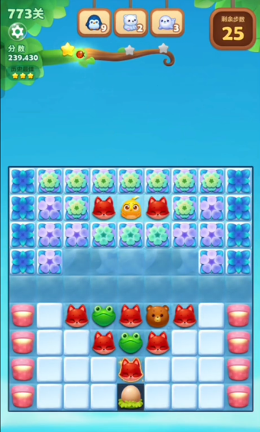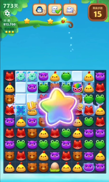 第773关要求你在有限的步数内消除大量的冰块。开局时你会看到冰块主要集中在版面中间,但周围被雪块和锁链给封住了,第一步千万别乱消,仔细观察一下布局,最好的策略是先找个口子打开。通常从上面或者侧边开始,想办法消除那些能动的动物,慢慢把封住中间区域的雪块给清理掉。这一步不能急,因为如果开头没开好,后面空间太小会很难制造特效。当清理了几块雪后,你会发现中间有魔法石,这就是过关的关键了,你的后续操作都要围绕点亮和利用魔法石来展开。