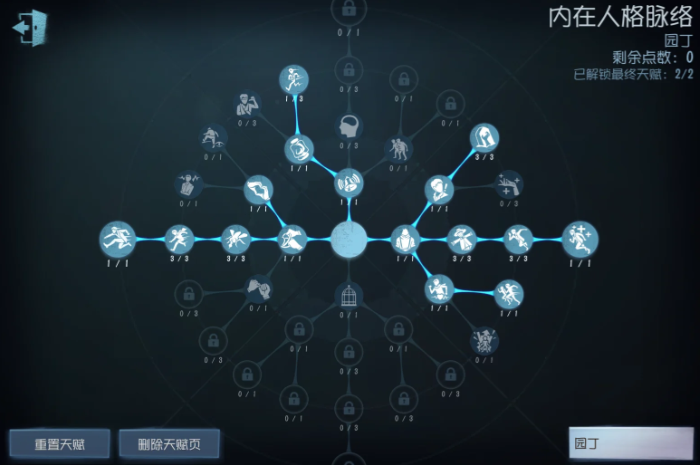 说到天赋和外在特质的搭配,这能进一步强化园丁的玩法。内在人格方面,由于园丁自身有安全感特质,被挂上椅子后起飞速度会减慢,所以不一定需要点出假寐。更推荐点一些增强自保和生存能力的,比如破窗理论配合膝跳反射可以让你在板窗区穿梭得更流畅,方便牵制和转点。求生意志可以加快从气球上挣扎下来的速度,和园丁的拆椅流打法非常契合。寒意则是个很好的预警天赋,能帮你判断监管者是否在看你。外在特质方面,除了自带的巧手匠心和机械熟识,她的庄园老友特质在被击中后能提供更长时间的加速,有助于拉开距离逃跑。