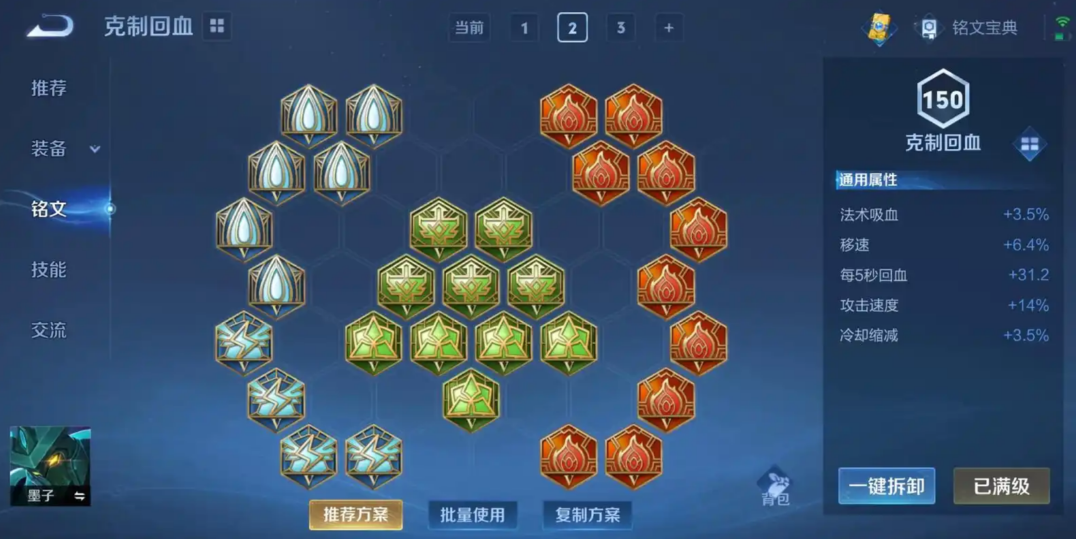 铭文搭配是红色带10个梦魇,绿色带10个心眼,蓝色带10个狩猎。这套铭文能提供法术攻击、法术穿透、攻击速度和移动速度。法术穿透能让墨子的技能打人更疼,尤其是面对那些带了一点魔抗的对手时;攻速能让墨子更快地打出第四次强化普攻,那个炮击带击退效果,有时候能用来保命或者留人;移速加成则让墨子走位和支援更灵活。在蓝色铭文里带一些贪婪或者轮回,提供一点法术吸血,增加线上的续航能力,但这样会牺牲一些移速。