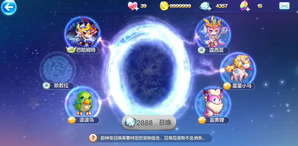 最常见的获取方法,就是收集指定的召唤材料然后进行召唤。根据不同的超神宠,官方会设定一组固定的宠物作为召唤材料,比如可能需要某一只SS级神宠、一只S级神宠再加上几只太阳宠。 这些作为材料的宠物来源有几个途径,一部分可以直接在游戏内的神秘商店用钻石或者更珍贵的七彩石购买到。 另一部分则还是可以通过传统的宠物合成方式来慢慢积累,比如用五个S宠去合成随机的SS宠。 当你费尽心思把这些指定的宠物都收集齐全之后,就可以去超神宠的召唤页面,通常还需要额外支付一笔钻石,比如2888钻,才能完成最终的召唤,让你心仪的超神宠永久加入你的队伍。