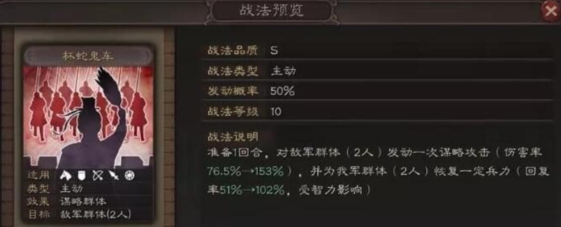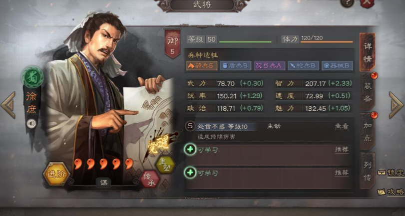 他的智力成长全游戏最高,统率也很出色,建议优先加点智力属性强化谋略伤害。战法搭配推荐夺魂挟魄+杯蛇鬼车,既能偷取敌方属性又能恢复兵力。兵种选择上弓兵和枪兵都是优质选项,可以配合无当飞军提升团队生存能力,或者组建枪兵控制队发挥缴械效果。