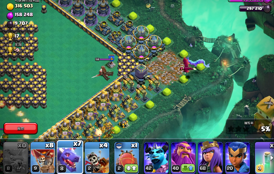 一个关键点在于与其他部队的协同,例如搭配英雄单位如野蛮人之王和弓箭女王,他们的技能可以为水龙提供支援或分担压力。法术释放的时机需要精准把控,应在水龙遭遇高强度抵抗或即将集火关键目标时使用。进攻过程中需根据战局灵活调整,例如在清理掉外围关键防御后,再指挥水龙向核心区域推进。需要避免的失误包括过度依赖水龙而忽视兵种搭配的平衡,以及未能根据敌方阵型及时调整进攻路线,导致部队被引导至陷阱区或浪费在无关紧要的建筑上。