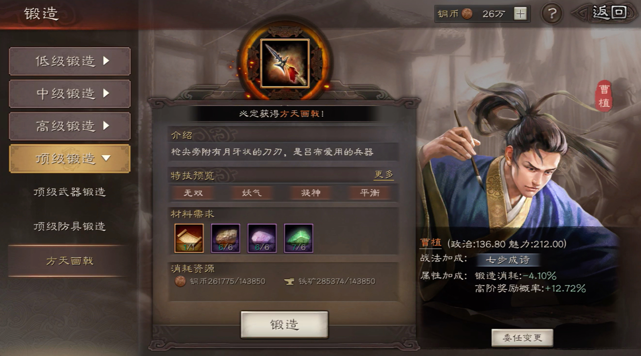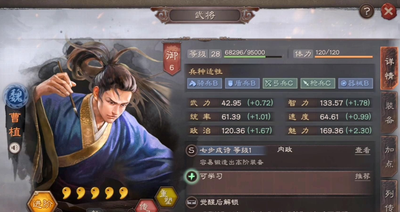 曹植是一位专注于内政管理的武将,其核心价值体现在锻造系统上。曹植的自带战法七步成诗能够在担任锻造官时提升高阶装备的产出概率,这让他成为资源积累中不可或缺的角色。由于高阶装备能显著增强武将的战斗力,曹植的存在帮助玩家更高效地获取稀有装备,从而在游戏中后期占据优势。