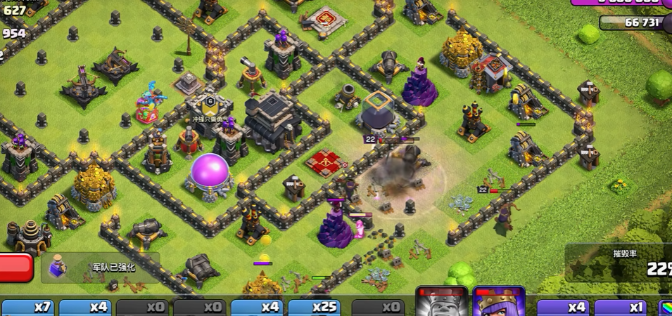 矿工与野猪骑士的组合构成了高效的矿猪流派,野猪骑士能够快速越过围墙锁定防御建筑,分散敌方火力,而矿工则利用潜行能力绕过外围障碍,直接攻击核心区域。这种配合能形成多路夹击,迫使敌方防御体系顾此失彼,玩家需注意野猪和矿工的投放时机与位置,避免部队过于分散,同时利用治疗法术覆盖关键交战区域。
