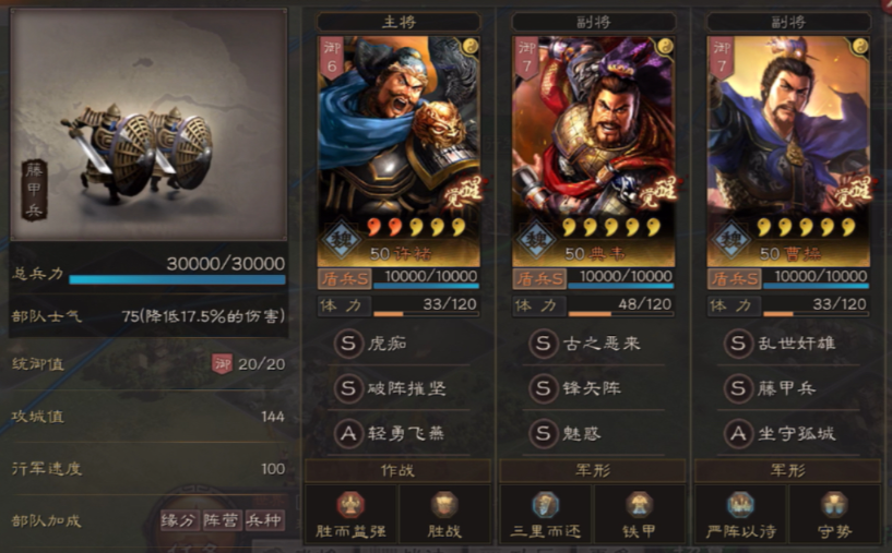 护卫盾是一套以高防御和反击见长的魏国盾兵阵容,其经典形态通常围绕曹操、典韦、许褚这三位武将构建。这套阵容的核心机制依赖于特殊兵种战法虎卫军,当主将即将受到普通攻击时,该战法能提升副将的武力值,并分别对攻击者造成兵刃伤害,形成高效的反击体系。若由典韦或许褚统领虎卫军,他们自身的统率还会获得额外提升,进一步增强了队伍的生存能力。