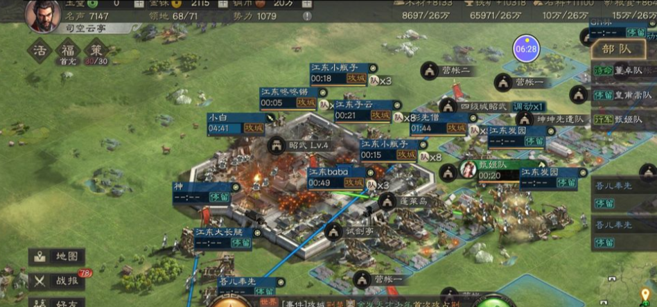 主力队伍的等级和战法等级是你能持续低损打地的保障。武将等级主要通过不断占领更高级的土地和扫荡来提升,而战法点则可以通过分解不需要的武将获得。前期获得的铜币不要乱花,尽量用来招募将领然后转化战法点,优先把主力输出的战法等级点高。两天时间很紧凑,你的体力分配要非常精细,确保主力队伍在升级建筑等待资源的关键时刻有体力可以去打地,形成一个资源获取和消耗的良性循环。