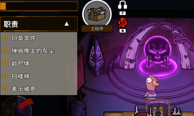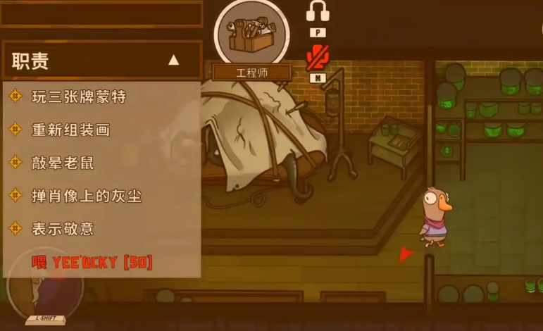 工程师是鹅阵营中的信息枢纽与隐蔽专家,其核心价值在于通过独特技能为好人阵营收集关键情报并执行战术观察。该角色的首要能力是当地图上存活的鸭子启动破坏任务时,工程师的小地图会显示一个红圈范围,用以估算触发破坏的鸭子的大致位置,这是锁定敌方动向的核心信息来源。与此工程师被赋予了暂时使用地图上各类藏匿点的能力,例如可以无限时间躲藏在盔甲、木桶、衣柜或马桶中,亦可作为管道工进入通风管道进行快速移动或隐蔽,不过进入管道后会在一定时间后被自动弹出。这两项技能的有机结合,使得工程师能够从暗处洞察全局,成为好人阵营中不可或缺的战略眼位。