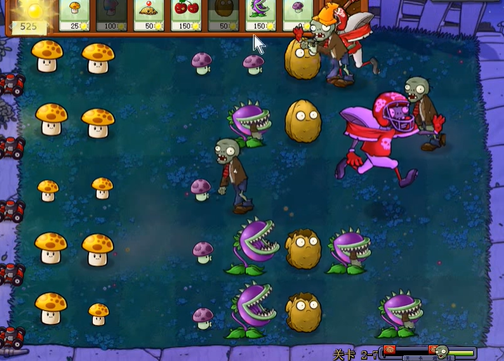 游戏进入中后期,将面临橄榄球僵尸、扶梯僵尸、冰车僵尸等强力敌人的混合冲击。对于成群结队的橄榄球僵尸,需要用高坚果阻挡其推进速度,并配合后方多个忧郁菇或机枪射手进行输出,也可预判其行进路线使用土豆雷进行范围杀伤。