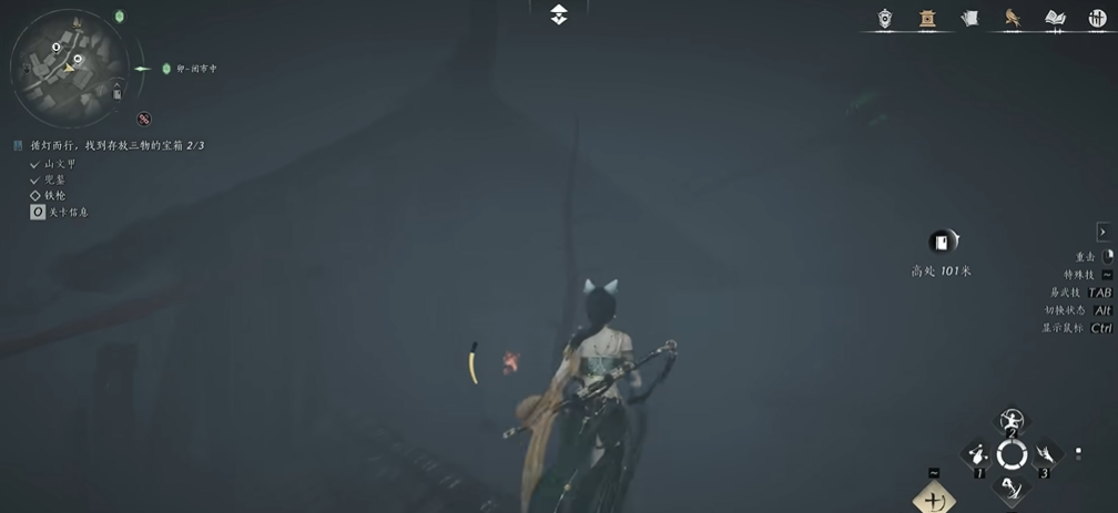 你首先需要前往鬼市,时间必须是在辰时。到达后,站在醒来时正对着的那扇门前,并且要仔细调整你的站位和视角,这个初始步骤很重要,如果没对准后面很容易出错。你需要利用跳跃技巧跳到附近的房檐上。上了房檐沿着左边的雾气方向前进,雾气会引导你前往正确的路径。接着你会走到一座桥上,这里需要注意避开桥上巡逻的阴兵,他们攻击力很强,最好不要让他们发现你。避开阴兵后,继续前进并跳跃到一个灯笼旁边。在灯笼附近你会看到一个箱子,开启这个箱子后就能获得铁枪了。