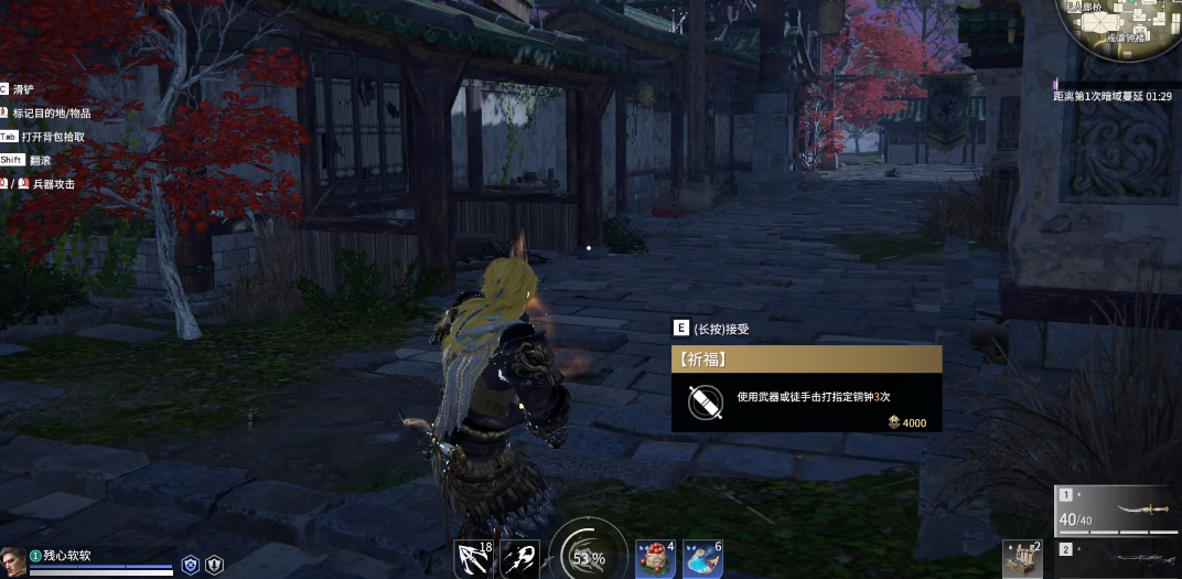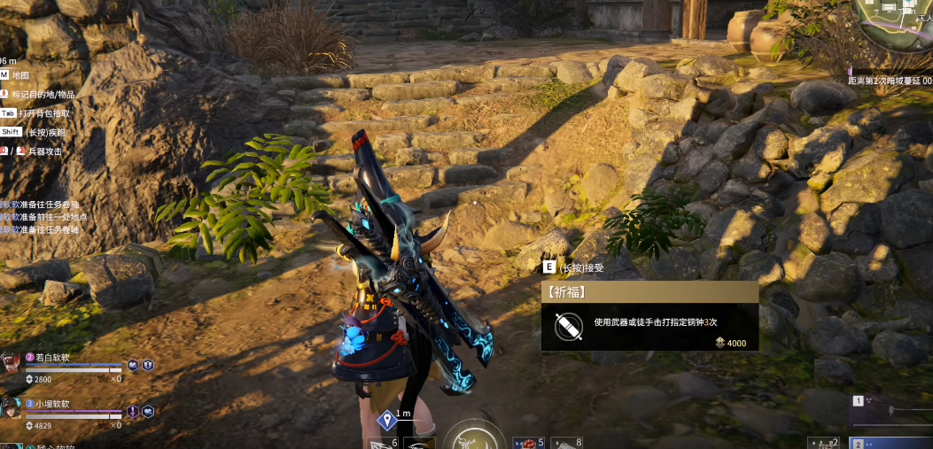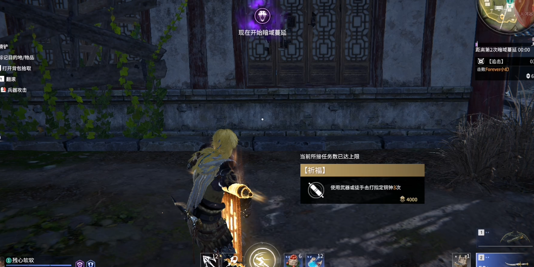 祈福任务是咱们在游戏里随机遇到的特殊挑战,接取后会在地图上标记出最近的祈福地点。到达目标位置后,通常会看到一口发光的钟,靠近互动提示用武器或徒手敲击三次,完成后就能拿到4000暗潮币奖励。敲钟不仅能完成任务,还能顺便探测周围80米内是否有敌人。如果是三排模式,不用非得接任务的队友去敲钟,谁离得近谁去更省时间。