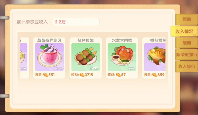 经营餐厅是出售料理的主要途径,每天可以营业2小时。开业前记得研究菜谱,尤其是当天的流行菜,出售流行菜能获得更多收益。提前升级餐厅硬件也能提高利润,比如增加桌椅和装饰。做好的料理要及时端到出菜口,避免放凉影响产量。雇佣拉姆当服务员能提升效率,最多可以雇4只,部分拉姆还有特殊技能能加快经营速度。