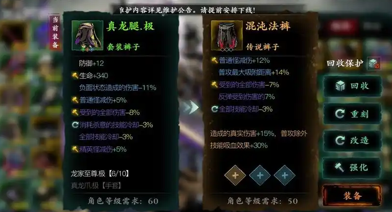 装备升阶至宗师品质是60级装备成型的必经阶段。通过吞噬同部位同等级套装装备可逐步提升词条属性,当所有词条满值后装备将自动进化为宗师品质。这一过程需消耗大量铜币和同类装备,建议优先选择核心输出装备如武器进行重点培养。锻造系统允许玩家将30-40级橙色装备直接进化为50级装备,但需消耗特定数量的绿晶石或绿晶内核,因此前期需针对性囤积材料。传说装备的锻造则需通过修罗塔、限时魔境等途径获取图纸与专属材料。
