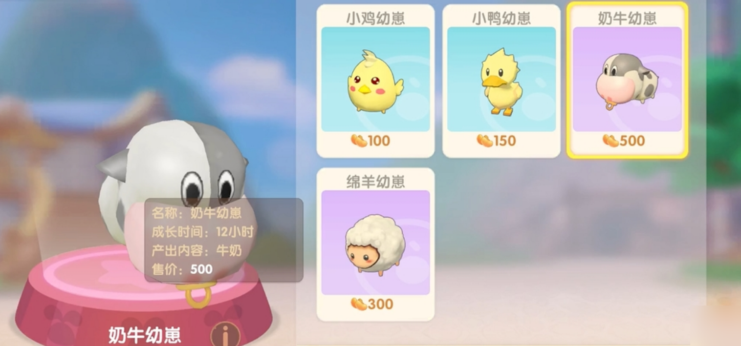 去尤尤的牧场商店逛逛,在那里可以找到各种农场动物幼崽,其中就包括咱们心心念念的小奶牛幼崽。只需要花费500摩尔豆就能把它带回家,不过记得要顺便买个挤奶桶哦,这可是后续获取牛奶的必备工具。带回家后需要好好喂养它,等它长大成年后才能开始产奶。每天记得定时喂食,保持营养充足,这样小奶牛才能健康快乐地成长。
