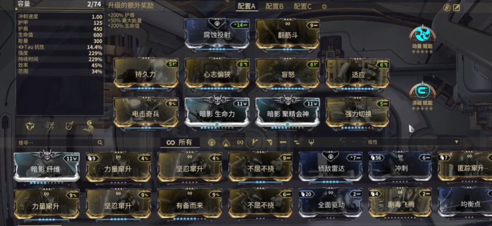 推荐使用电男(Volt)作为主力战甲,MOD主堆强度和持续,同时移植丑四开技能来提升伤害。大傻对辐射属性弱点明显,因此武器元素建议带电和火组合。电男自带电击奇兵配卡,可以省去武器上的电元素MOD,让输出更集中。专精选择M精,重点点出M1和M2,分别增强重击和震波效果,力量转移则根据实际情况调整。
