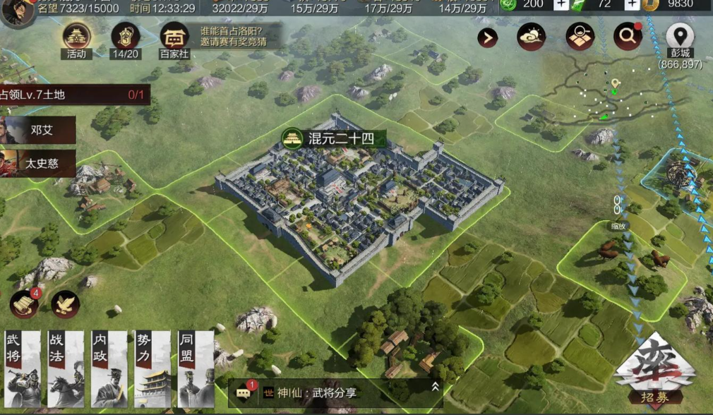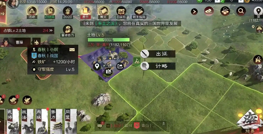 增加占领地的核心途径是提升名望值。名望值与领地上限直接挂钩,每100点名望可增加1块领地上限,最高可达450块。名望随时间自然增长,但更快的方式是完成主线任务、占领高等级土地或建造分城及社稷坛。分城建造需以6级地为中心,占据九宫格形状的9块相连土地,建成后可提升税收和资源产量,同时增加名望值。