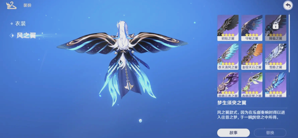 确定好要更换的风之翼后,点击右下角的替换按钮即可完成操作。系统会提示确认更换,点击确定后角色立刻会装备新的风之翼。这时候退出界面,从高处跳下就能看到全新的滑翔效果了。更换风之翼不会影响角色属性和战斗能力,纯粹是外观上的个性化调整。如果想换回原来的款式,重复上述步骤选择初始风之翼即可。
