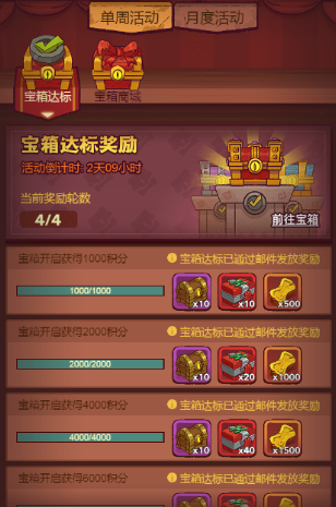 宝箱周活动是咱们发力的时候,平时攒的箱子全留到这时候开。木质宝箱开得越晚收益越高,因为通关层数会影响开箱奖励,但青铜以上的箱子可以直接开不用等。每周完成四轮活动最划算,每轮需要准备3400分左右的箱子,开箱过程中系统还会返积分,实际能冲到8000分拿满奖励。千万别手痒平时乱开箱子,等活动来了看着成堆的奖励才叫爽。