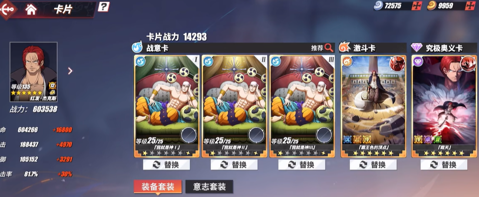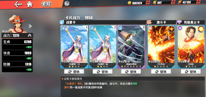 绿色战意卡属于通用型,适合所有角色,不需要特定激活条件,直接装备就能生效,建议优先给主力伙伴携带。绿色卡分两种,一种加生命,一种加防御,根据需求选择。蓝色战意卡则分为力、技、心三种属性,虽然增强效果相同,但必须匹配角色属性才能激活套装效果,所以选择时注意角色类型。紫色战意卡更细分,比如路飞、娜美、山治等专属卡,暴击率加成高达20%,攻击力提升12%,选择时可以根据角色属性和需要的增益效果来搭配。