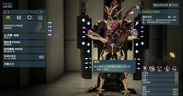 Nekros(俗称摸尸甲)是一款以操纵死亡为核心机制的战术型战甲,其设计灵感源自亡灵法师,擅长通过召唤亡魂、掠夺尸体资源及削弱敌人战意改变战场局势。该战甲在资源收集与团队辅助领域具有不可替代的战略价值,尤其适合高难度生存任务与材料 farming 场景。