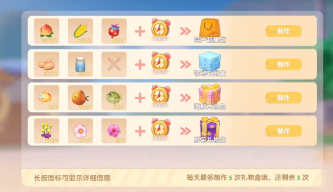 除了直接送礼,还可以去琦琦那里制作礼盒,比如鲜花礼盒、牧场礼盒或者海鲜大礼包,这些礼盒能一次性加不少好感度。有些居民会来家里做客,记得提前检查邮箱,他们会提前发信通知。做客时他们会带来一些稀有商品,比如梅森会卖特殊种子,丝尔特会带限定家具,这可是刷好感度的好机会。