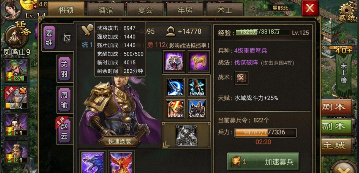 高级符文能提升技能伤害或减少冷却时间,优先给主力武将镶嵌。装备洗炼时注意保留增加技能等级的属性,这类加成能让技能产生质变。同时别忘了定期强化装备基础属性,攻击和防御数值会直接影响技能的实际效果。觉醒后的武将不仅基础属性大幅提升,还能解锁特殊技能效果。觉醒需要消耗特定道具,平时要多积累觉醒石和觉醒酒。建议先觉醒主力阵容中的核心武将,不要分散资源。觉醒后的技能会有全新特效和机制,完全改变战斗方式。