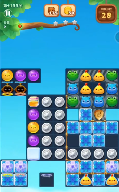隐藏关133关的任务目标有两个,一个是消除175只小熊,另一个是收集50个蜂蜜,总共步数只有28步,时间上还是挺紧张的。开局的时候地图上有很多雪块障碍,右上角、左下角和中间区域都被雪块挡住了,最需要注意的就是左上角那块区域有一层冰做的隔板,这个隔板千万不能提前打碎,因为后面需要靠它来提供足够数量的小熊,如果隔板过早破了,小熊的数量就不够了,任务也就没法完成。所以第一步不是急着到处消,而是先看清楚布局,保护左上角的隔板是贯穿整个关卡的核心思路。