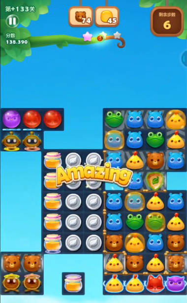 到了游戏中后期,就是两边任务兼顾的节奏。一边要持续用染色宝宝单换小动物来刷小熊数量,小熊数降到50以内之前,尽量不要做多余的操作以免破坏隔板。另一边要抓住机会,用各种特效,特别是右下角生成的横向特效,去攻击底部的蜂蜜罐。这里有个很重要的禁忌,就是千万不要去组合魔力鸟特效,比如魔力鸟和直线特效交换,或者两只魔力鸟互换,这种大范围爆炸很容易把左上角要命的冰隔板给震碎,一旦隔板碎了,基本就可以重开了。所以安安心心用染色宝宝和普通的横向、竖向特效就好。