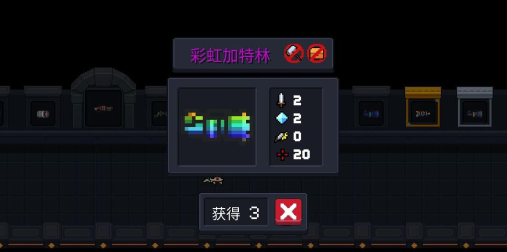 玩家可以通过合成获得彩虹武器,使用红黄蓝冲锋枪与骑士之拳结合即可制作,这需要收集魔法碎片等资源,进入地牢后携带这两把武器,在遇到第三把武器时替换其中一件,攻击键上方会出现合成按钮,点击完成制作,为后续使用或融合提供基础。彩虹的一个重要用途是与加特林融合生成彩虹加特林,这种融合武器继承了加特林的高射速特性,同时保留彩虹的多元素效果,子弹会随机触发火、冰、毒等属性,暴击时附加灼烧、冰冻或中毒状态,提升了清怪效率和战斗适应性。