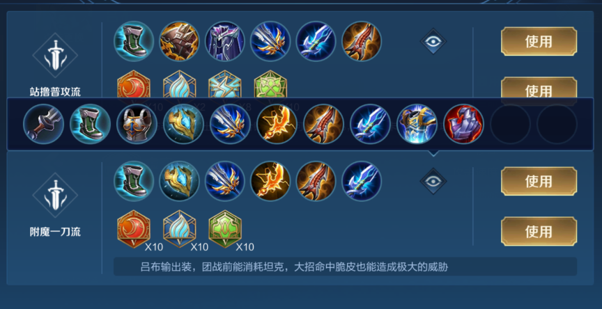 基于出装吕布应在对线期稳健发育,后期积极参团,前期主加二技能利用兵线回复生命,保持附魔状态消耗对手,四级后谨慎使用大招,优先观察敌方控制技能状态再入场。团战中吕布可作为后手切入角色,利用大招封锁敌方撤退路线或分隔前后排,附魔状态下优先攻击脆皮英雄,真实伤害无视护甲直接削减生命值,装备成型后吕布在中期进入强势期,需配合队友争夺资源并避免单带过深。