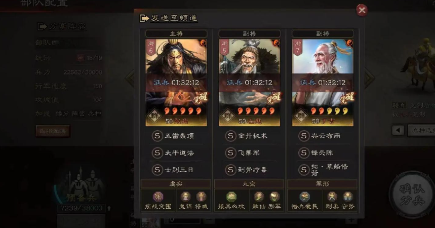 兵力不仅在于数量,更在于质量,战法系统的完善与部队加成的合理利用,能让你的部队实力产生化学反应。每个武将在5级时会解锁第二个战法孔,而在20级且自带战法满级后可以觉醒,进而解锁第三个战法孔。为你的主力武将配齐三个强力的战法,队伍的攻防能力和战术维度将得到巨大提升,这意味着一支高兵力的部队能发挥出更强的实战效能。另巧妙运用游戏内的部队加成机制,可以在不改变带兵上限的情况下,极大增强整体战斗力。派遣有历史渊源的武将共同出战激活缘分加成,或组建纯魏、蜀、吴等同阵营队伍来获得阵营加成,都能带来可观的额外属性。确保你的武将率领其兵种适性最高的部队,比如S级适性可以发挥120%的属性,这同样是优化兵力质量的关键。