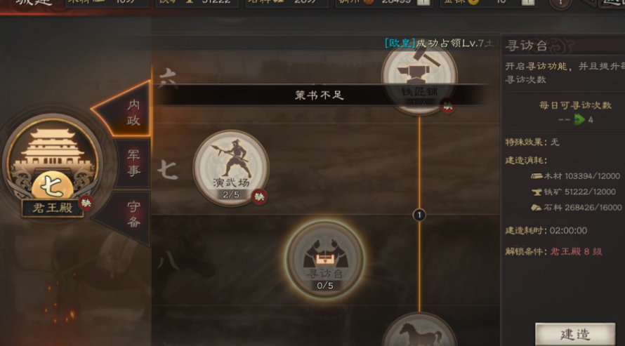 除了武将本身的成长,主城内的城建布局与发展是支撑兵力飞跃的坚实后盾。你需要跟随主线任务快速提升君王殿的等级,因为许多关键建筑都与之挂钩。当君王殿达到7级后,至关重要的军营便会解锁,升级军营能够直接、按比例地提升你所有武将的带兵上限,这是中期以后兵力实现质变的核心建筑。像征兵处这样的建筑可以缩短补充兵力的时间,让你在连续征战后的恢复期大大缩短。而农场、采石场等资源建筑的等级则决定了你的资源产出效率,确保你有源源不断的粮食和石料来支撑庞大的征兵消耗与建筑升级需求,避免因资源短缺而停滞。