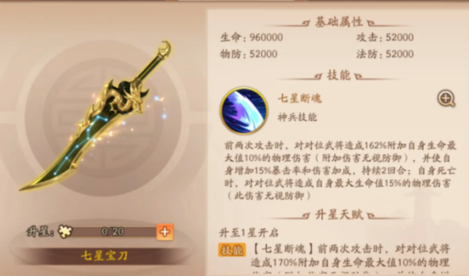 具体选择哪一把神兵,并非一成不变,首要考量因素是卫庄自身的培养星级。普遍的观点是,在卫庄星级较低、资源有限的前期或中期阶段,七星宝刀是性价比更高的选择,它能有效优化输出效果,保障基础的暴击和伤害。当玩家投入资源将卫庄培养至高星,特别是星级拉满后,青龙偃月刀的优势将彻底展现,其附带的防御加成和无视防御的最大生命值伤害能让他产生质变,成为攻守兼备的战场核心。根据培养进度动态调整神兵,是玩好卫庄的必修课。
