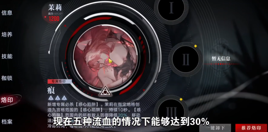茉莉的加入对于流血队而言是一次显著的飞跃。她带来了全新的第五种生命流逝效果来源,而流血队中许多角色的增益效果,如德雷雅的枷锁、胡椒与李维的专属烙印等,其加成数值都与场上生命流逝的种类数量挂钩。茉莉的加入意味着这些增益效果的层数上限被提高,从而从多个乘区整体拉高了流血队的伤害上限。她的专属烙印痕进一步强化了这一优势,当茉莉在场时,敌人身上每有一种不同来源的生命流逝,受到的物理伤害就会提高,最高可叠加数层,提供了珍贵的物理易伤效果。专属烙印还赋予她一个新的专属必杀惑心陷阱,能在指定区域创造持续一段时间的九宫格陷阱,降低范围内敌人的防御与移动速度,兼具软控与增伤。