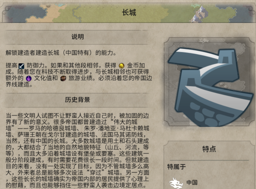 长城的规划与建造是秦始皇走向文化胜利的基石。长城不仅能提供稳定的金币和文化产出,还是强大的防御设施。建造长城时需要精心规划布局,尽量将其修建在丘陵地块上以获取更高收益,同时让长城的线路尽可能蜿蜒曲折,以便在有限的地块内容纳更多的长城段,最大化其产出。通常在城堡时代前后或建造者有盈余时,就要开始着手规划长城的走向。